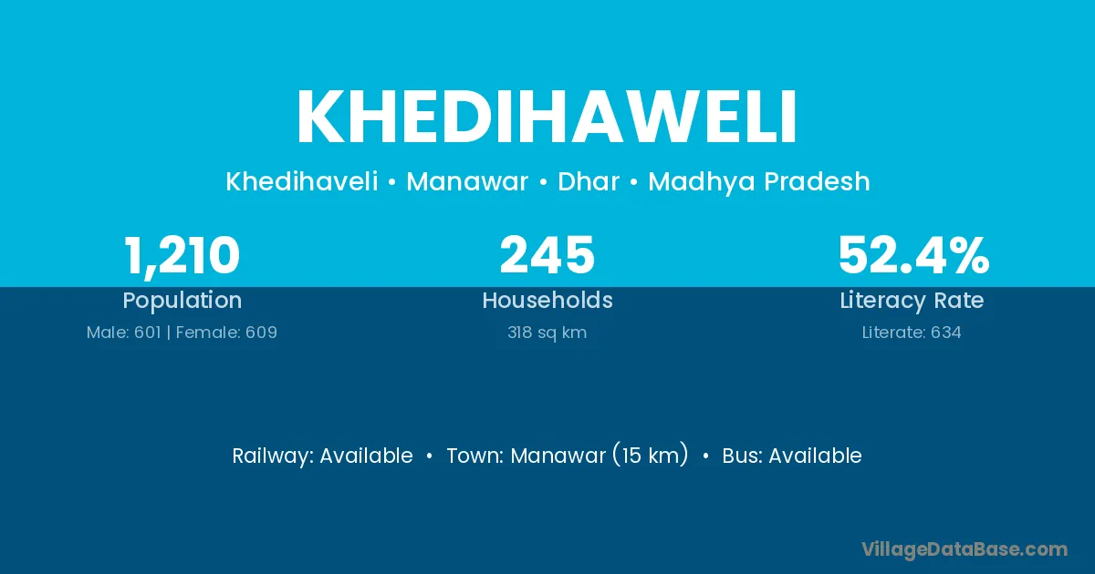 Manawar (15 km) is the nearest town to Khedihaweli village for major economic activities and is located approximately 15 km away.
