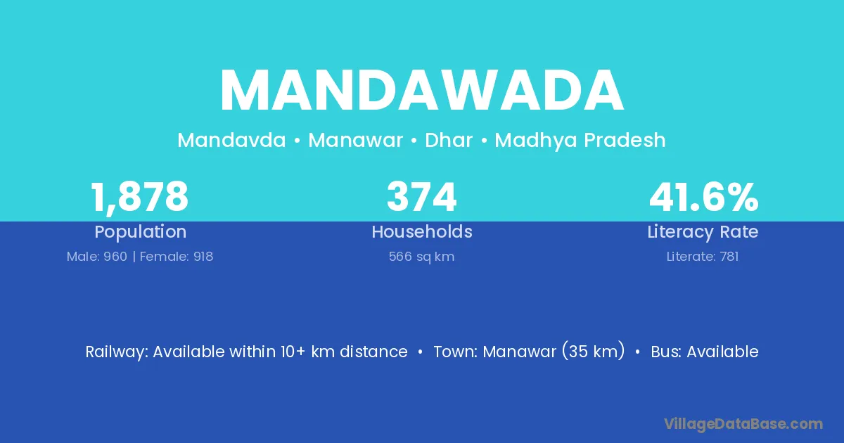 Manawar (35 km) is the nearest town to Mandawada village for major economic activities and is located approximately 35 km away.