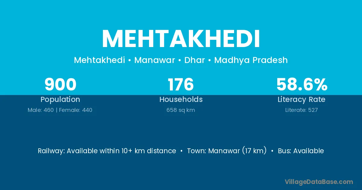 Manawar (17 km) is the nearest town to Mehtakhedi village for major economic activities and is located approximately 17 km away.