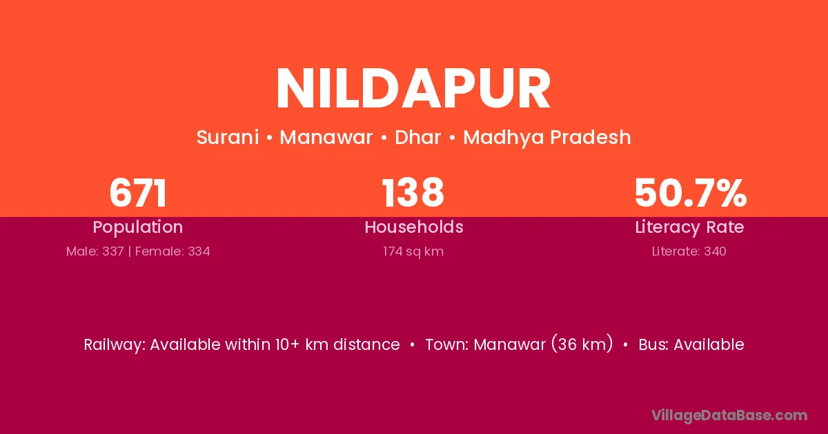 Manawar (36 km) is the nearest town to Nildapur village for major economic activities and is located approximately 36 km away.