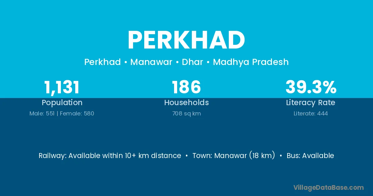 Manawar (18 km) is the nearest town to Perkhad village for major economic activities and is located approximately 18 km away.