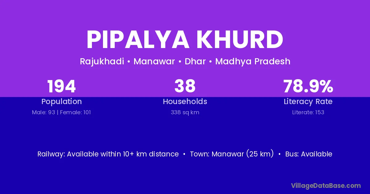 Manawar (25 km) is the nearest town to Pipalya Khurd village for major economic activities and is located approximately 25 km away.