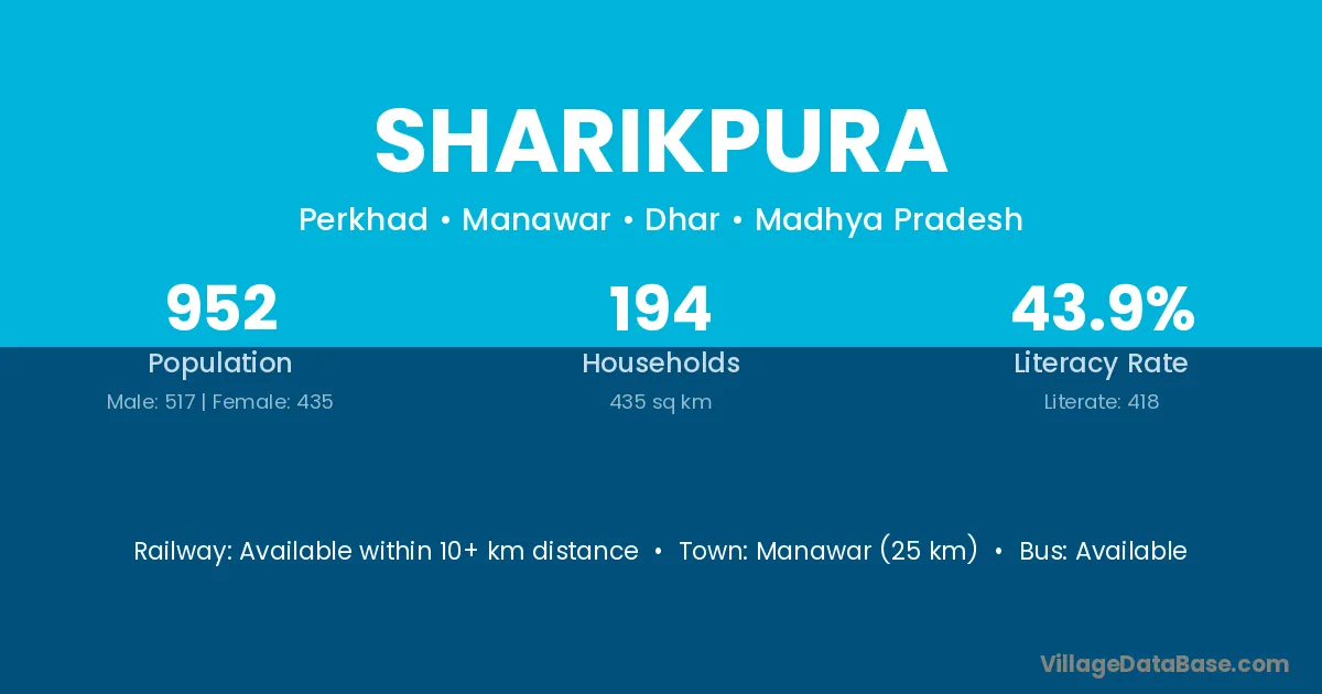Manawar (25 km) is the nearest town to Sharikpura village for major economic activities and is located approximately 25 km away.