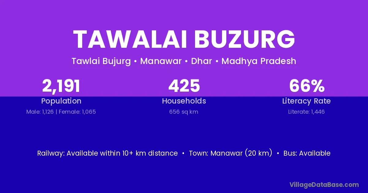 Manawar (20 km) is the nearest town to Tawalai Buzurg village for major economic activities and is located approximately 20 km away.