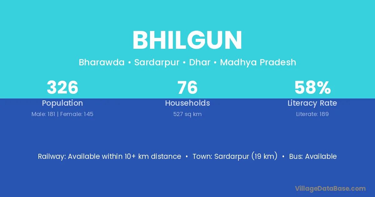 Sardarpur (19 km) is the nearest town to Bhilgun village for major economic activities and is located approximately 19 km away.