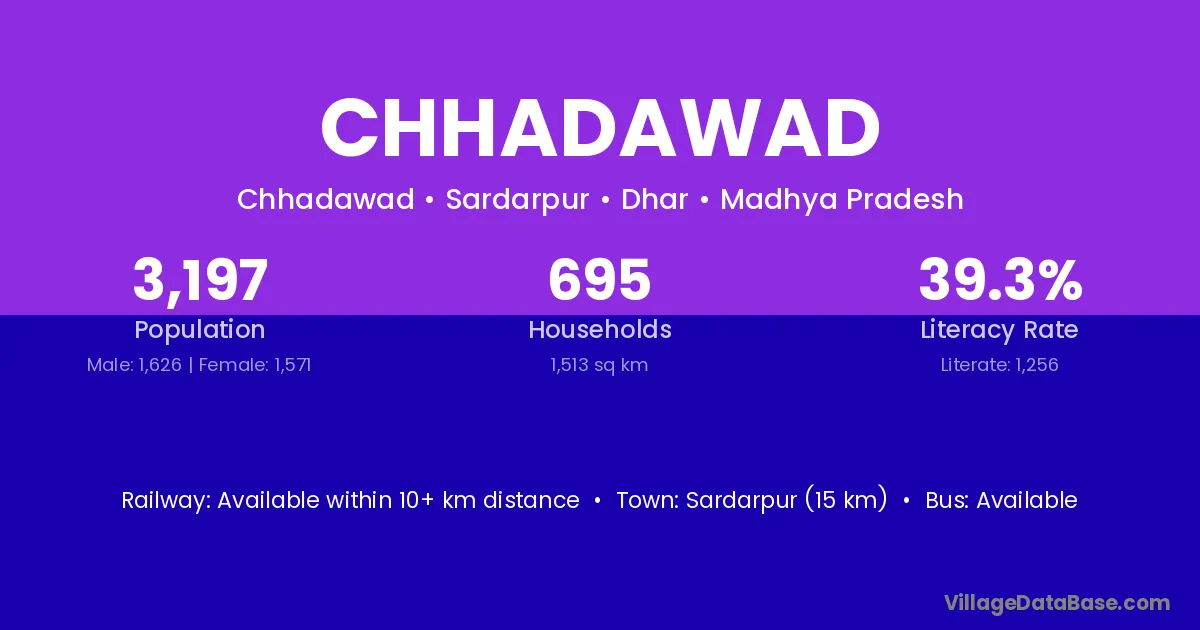 Sardarpur (15 km) is the nearest town to Chhadawad village for major economic activities and is located approximately 15 km away.