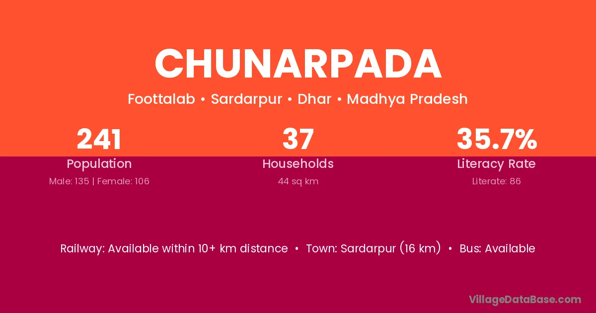 Sardarpur (16 km) is the nearest town to Chunarpada village for major economic activities and is located approximately 16 km away.
