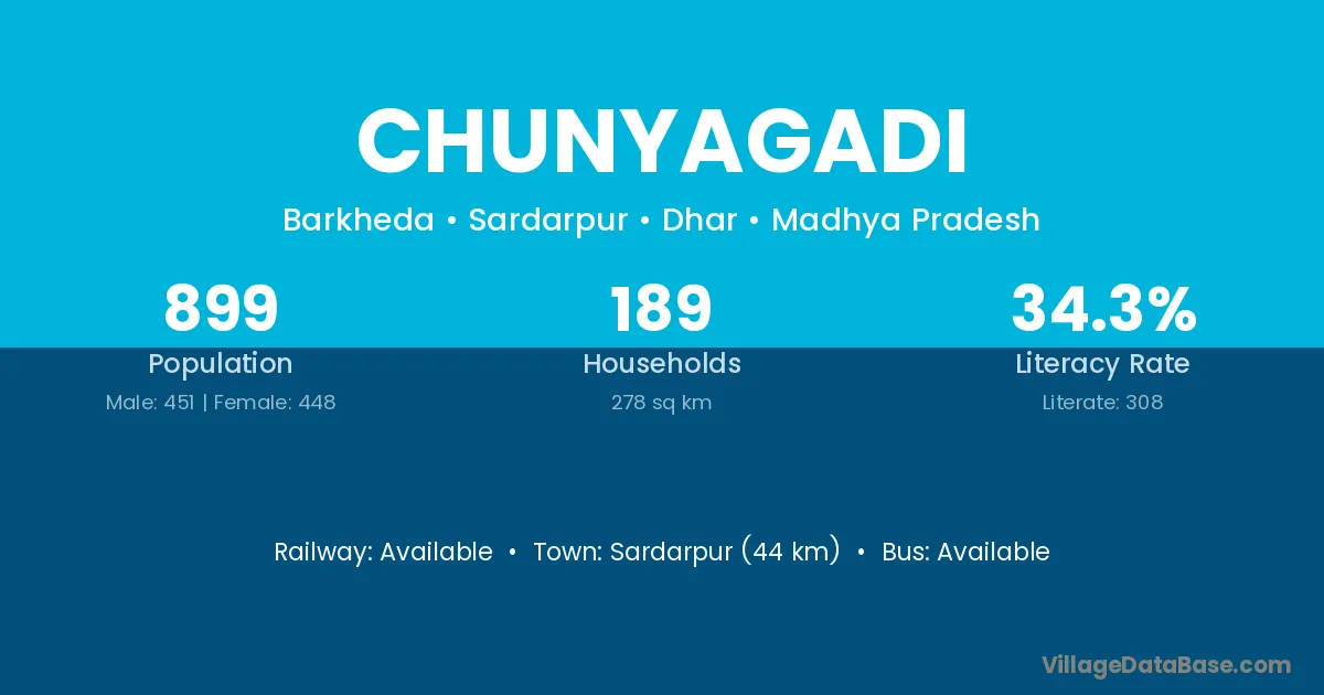 Sardarpur (44 km) is the nearest town to Chunyagadi village for major economic activities and is located approximately 44 km away.