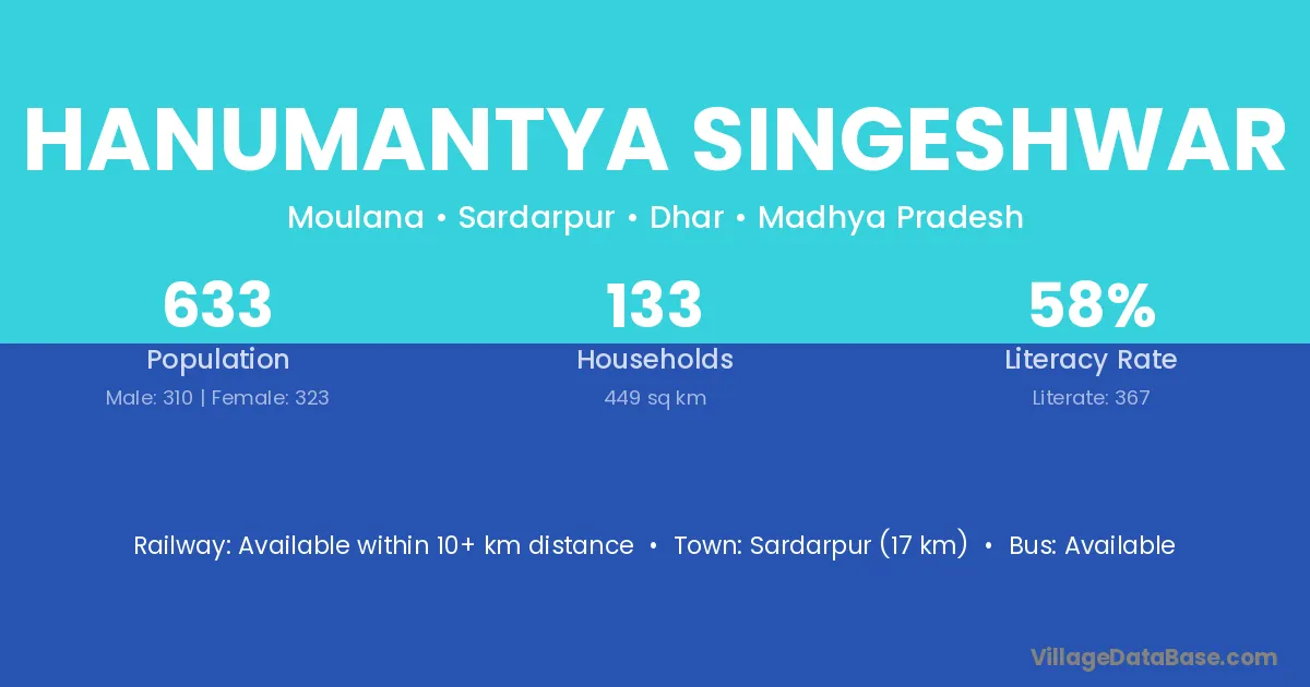 Sardarpur (17 km) is the nearest town to Hanumantya Singeshwar village for major economic activities and is located approximately 17 km away.
