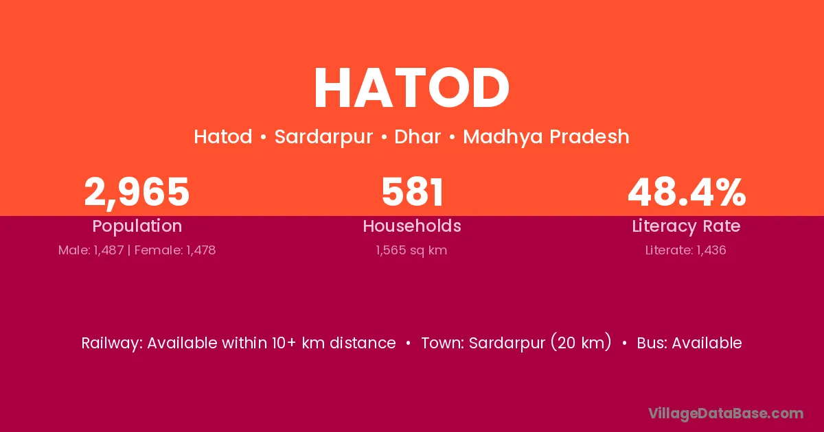 Sardarpur (20 km) is the nearest town to Hatod village for major economic activities and is located approximately 20 km away.
