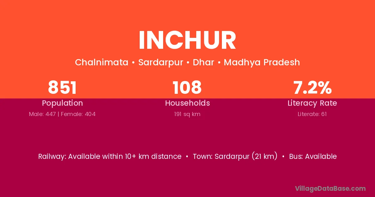 Sardarpur (21 km) is the nearest town to Inchur village for major economic activities and is located approximately 21 km away.