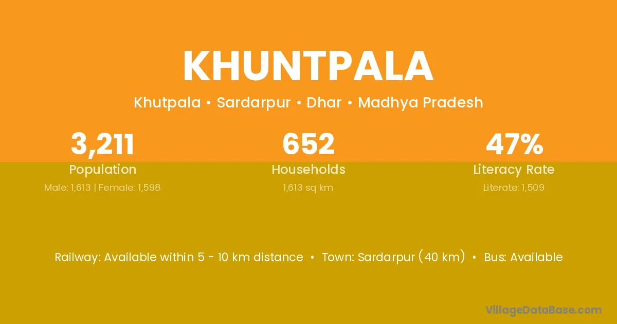 Sardarpur (40 km) is the nearest town to Khuntpala village for major economic activities and is located approximately 40 km away.
