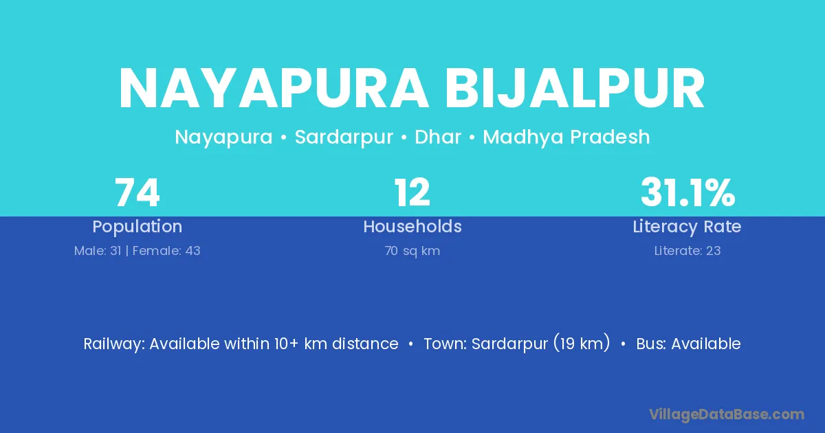 Sardarpur (19 km) is the nearest town to Nayapura Bijalpur village for major economic activities and is located approximately 19 km away.