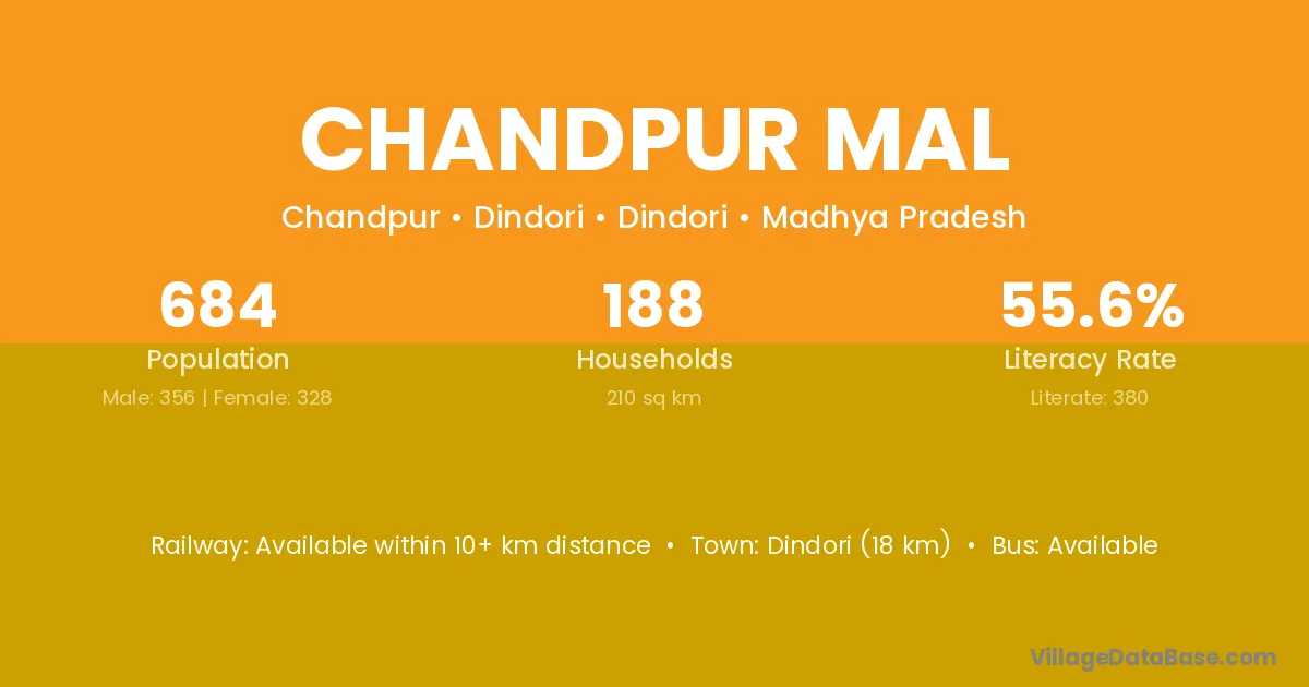 Dindori (18 km) is the nearest town to Chandpur Mal village for major economic activities and is located approximately 18 km away.