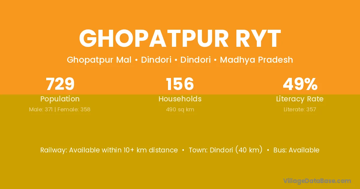 Dindori (40 km) is the nearest town to Ghopatpur Ryt village for major economic activities and is located approximately 40 km away.