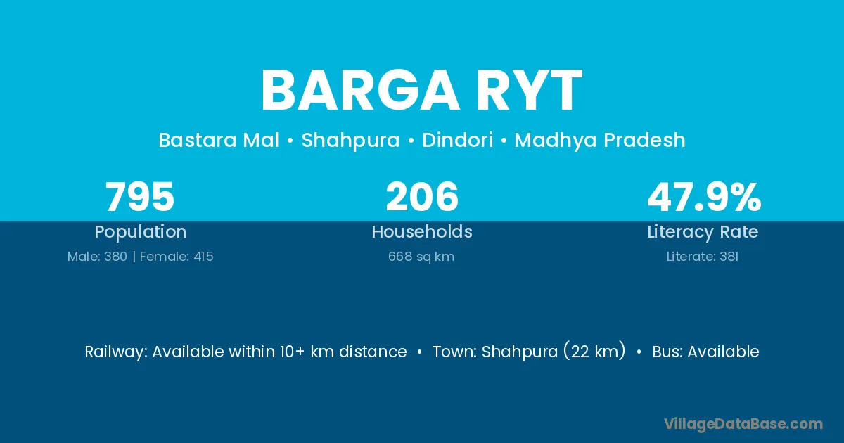 Shahpura (22 km) is the nearest town to Barga Ryt village for major economic activities and is located approximately 22 km away.