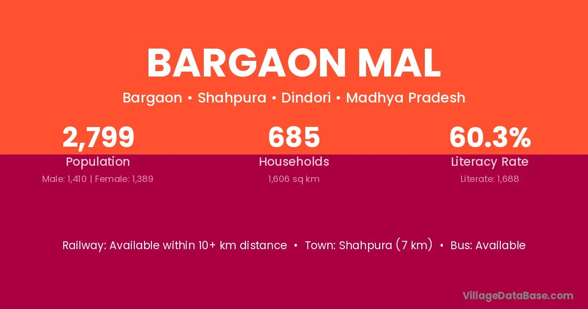 Shahpura (7 km) is the nearest town to Bargaon Mal village for major economic activities and is located approximately 7 km away.