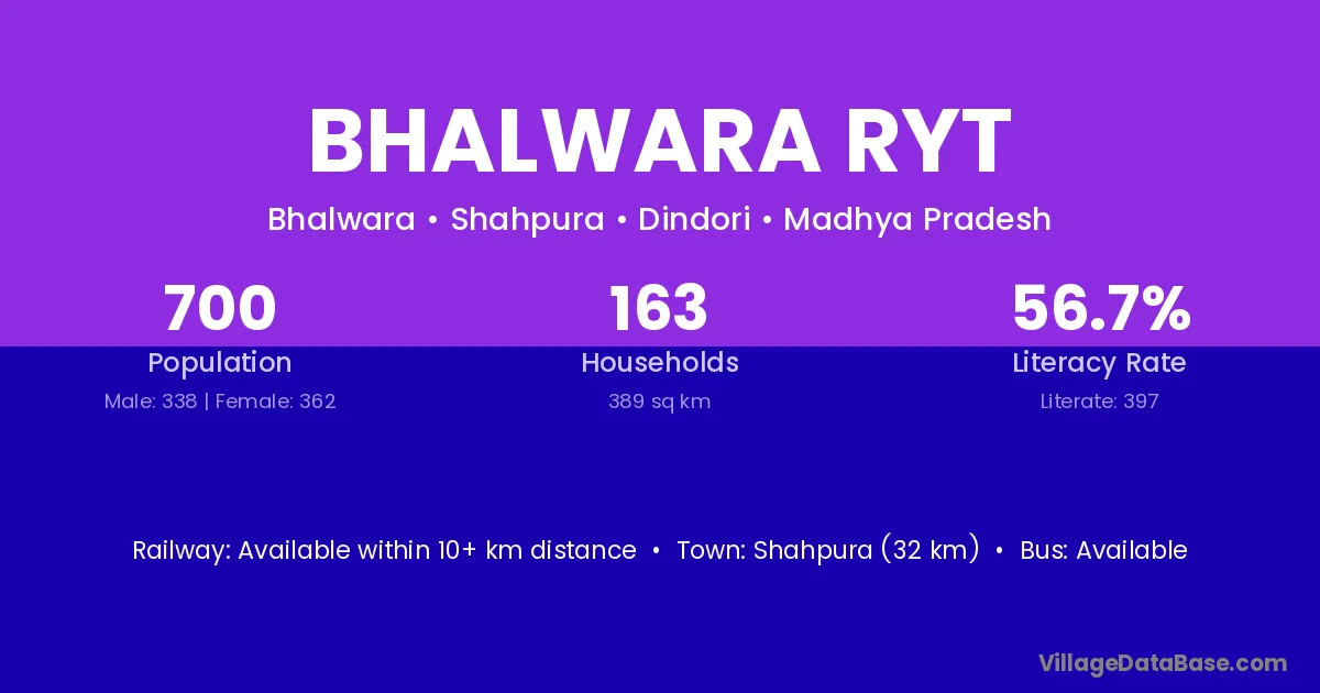 Bhalwara Ryt village has a total population of 700 people, of which 338 are males and 362 are females.