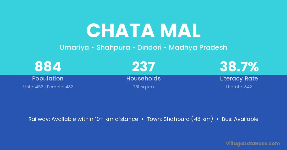 Chata Mal village has a total population of 884 people, of which 452 are males and 432 are females.
