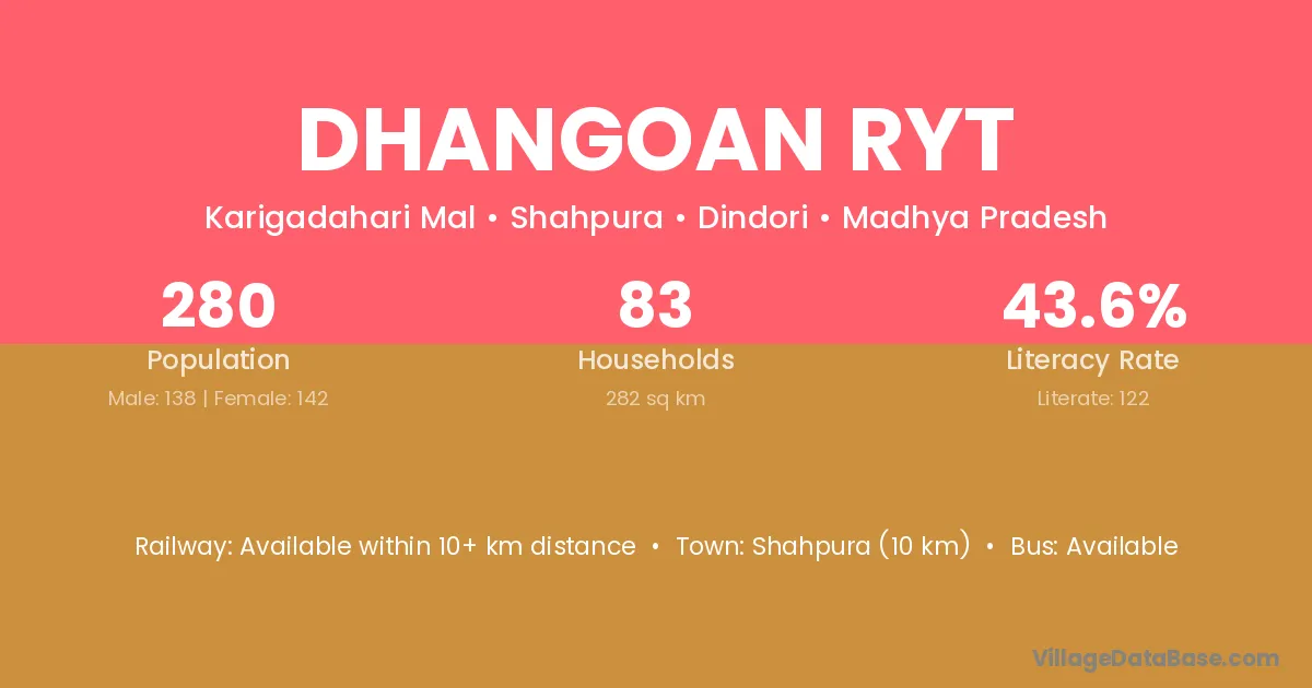 Dhangoan Ryt village has a total population of 280 people, of which 138 are males and 142 are females.