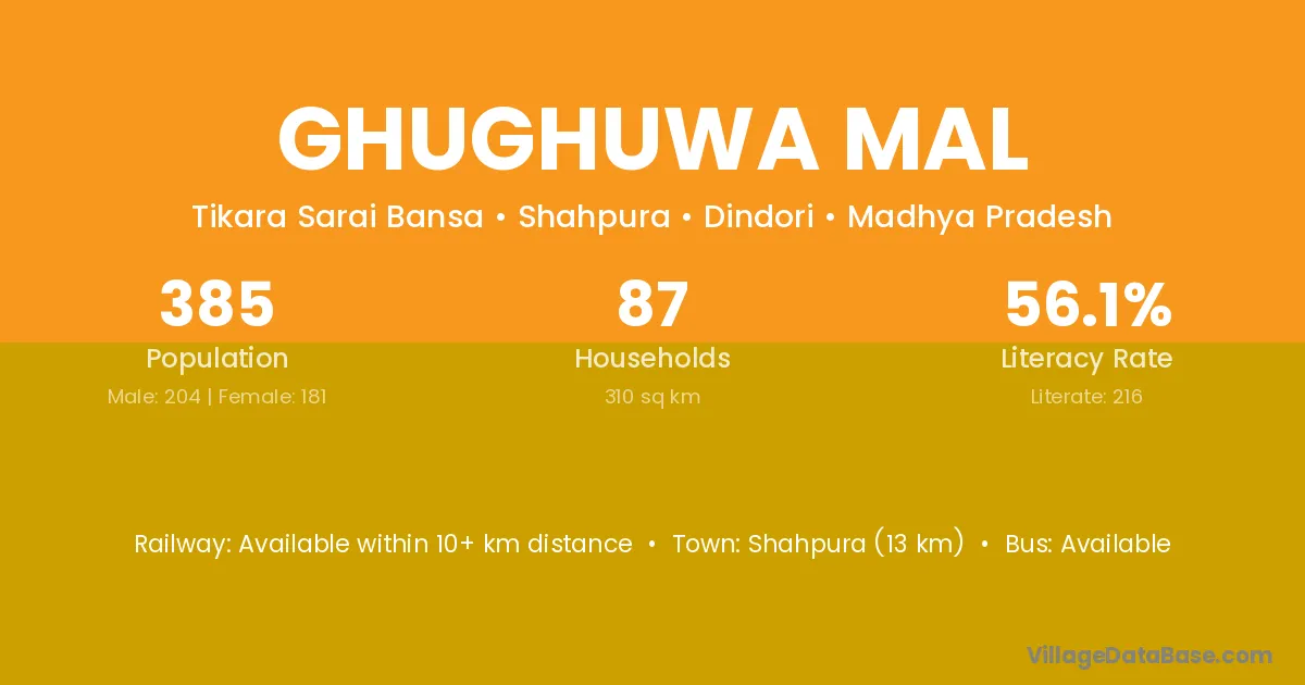 Ghughuwa Mal village has a total population of 385 people, of which 204 are males and 181 are females.