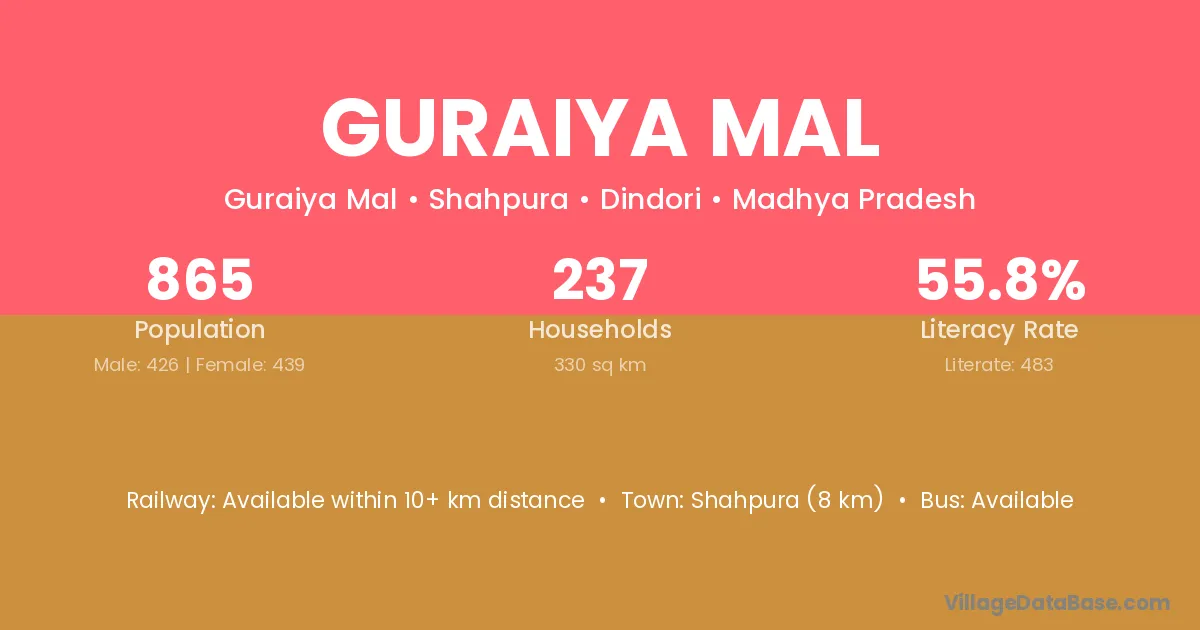 Guraiya Mal village has a total population of 865 people, of which 426 are males and 439 are females.