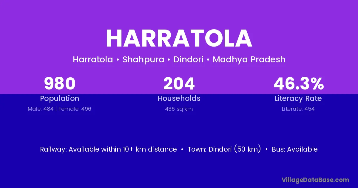Dindori (50 km) is the nearest town to Harratola village for major economic activities and is located approximately 50 km away.