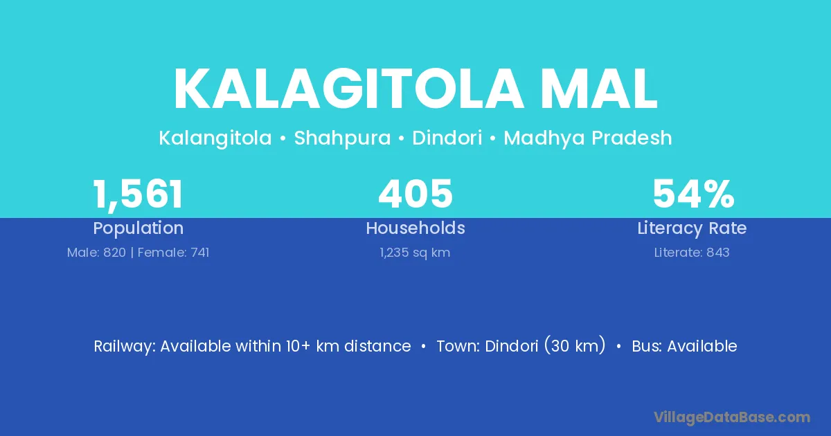 Dindori (30 km) is the nearest town to Kalagitola Mal village for major economic activities and is located approximately 30 km away.