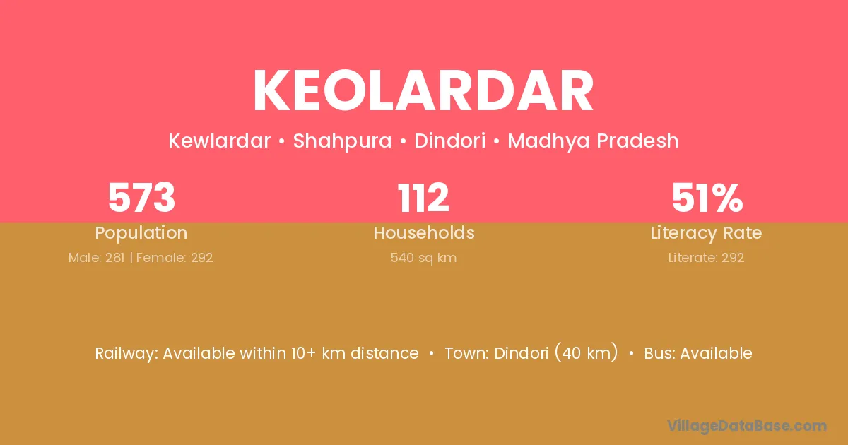 Dindori (40 km) is the nearest town to Keolardar village for major economic activities and is located approximately 40 km away.