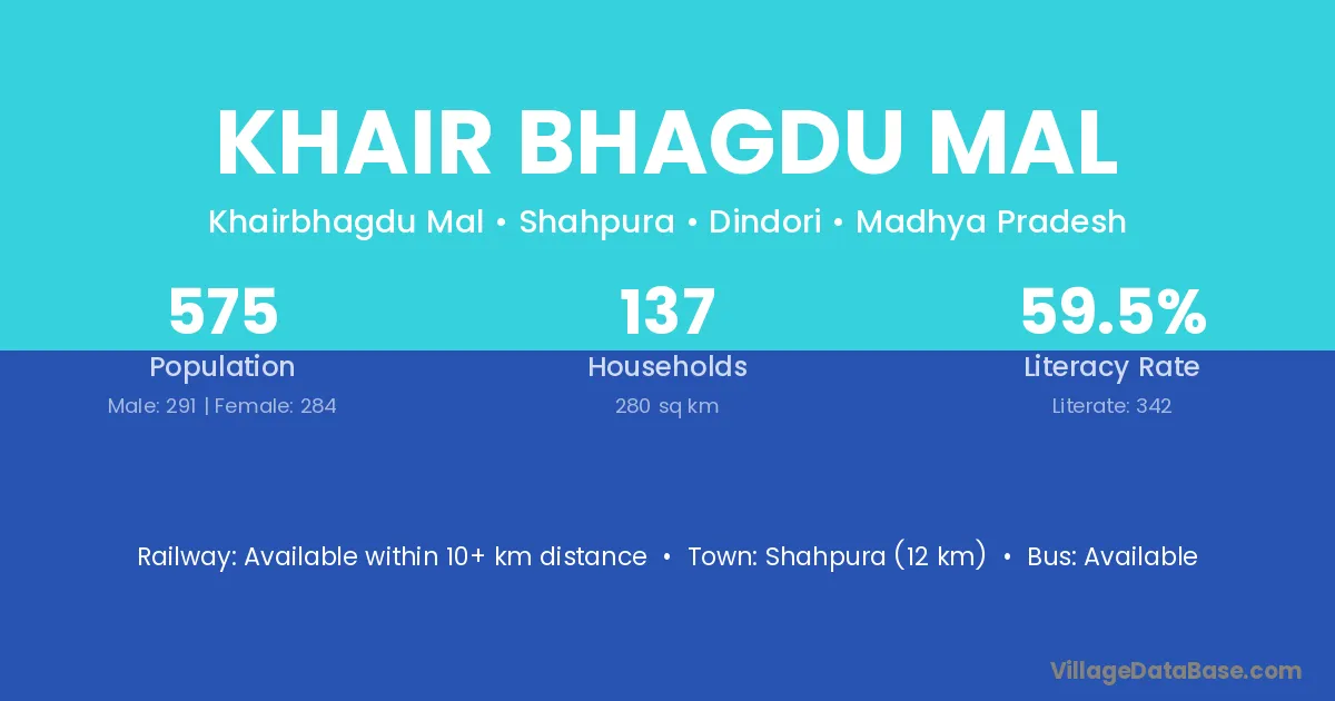 Khair Bhagdu Mal village has a total population of 575 people, of which 291 are males and 284 are females.