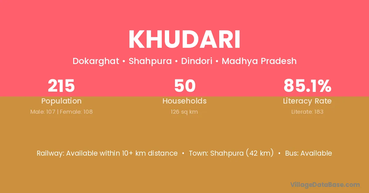 Khudari village has a total population of 215 people, of which 107 are males and 108 are females.
