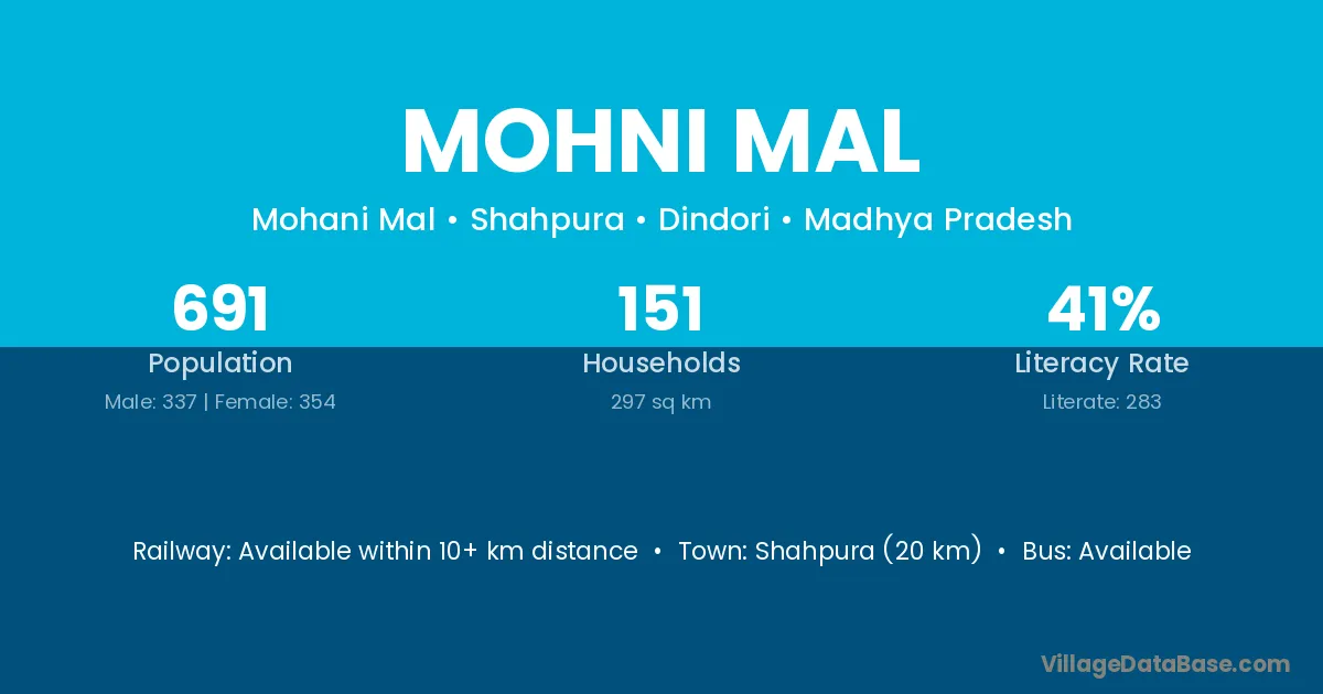 Mohni Mal village has a total population of 691 people, of which 337 are males and 354 are females.