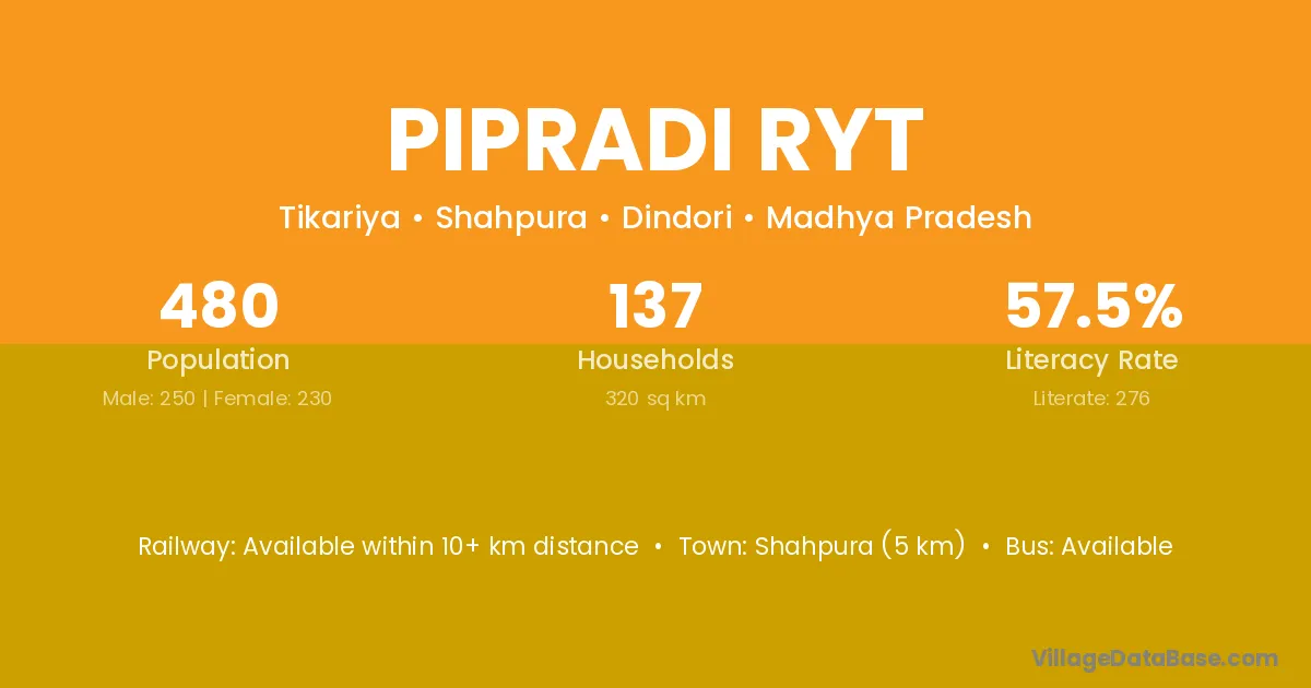 Pipradi Ryt village has a total population of 480 people, of which 250 are males and 230 are females.