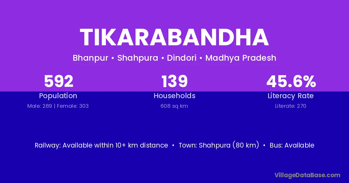 Shahpura (80 km) is the nearest town to Tikarabandha village for major economic activities and is located approximately 80 km away.