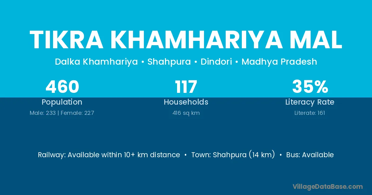 Tikra Khamhariya Mal village has a total population of 460 people, of which 233 are males and 227 are females.