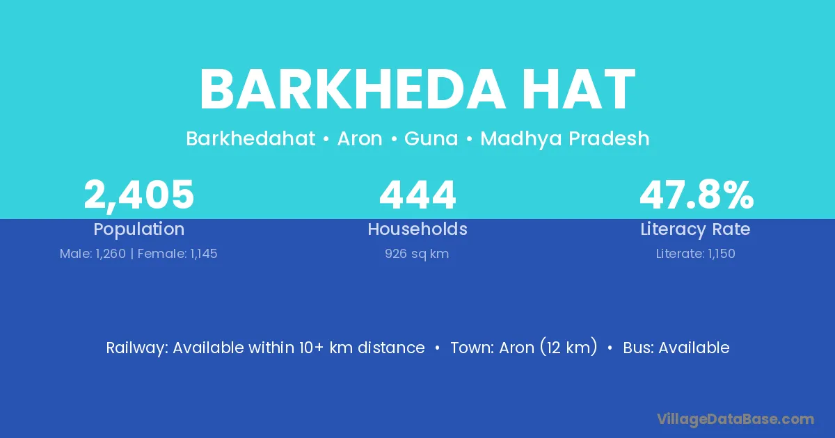 Aron (12 km) is the nearest town to Barkheda Hat village for major economic activities and is located approximately 12 km away.