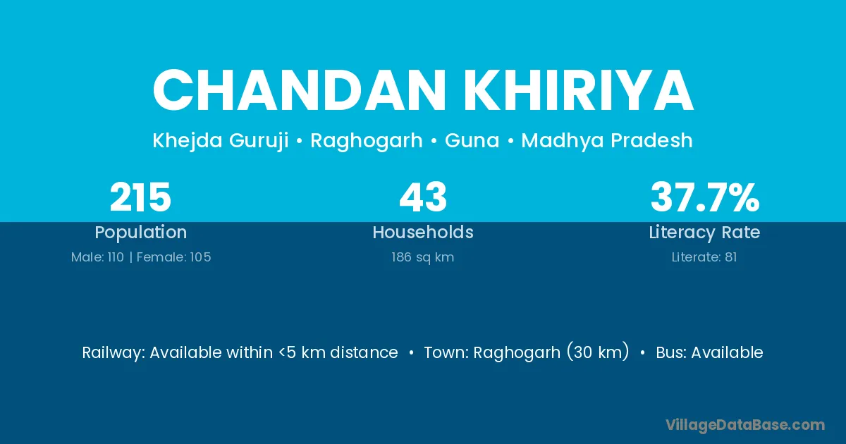 The literacy rate of Chandan Khiriya village is 32.55%. Male literacy stands at 37.93% and female literacy at 26.04%.