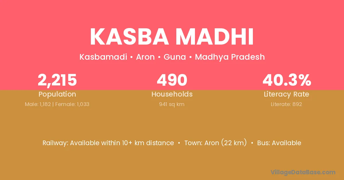 Aron (22 km) is the nearest town to Kasba Madhi village for major economic activities and is located approximately 22 km away.