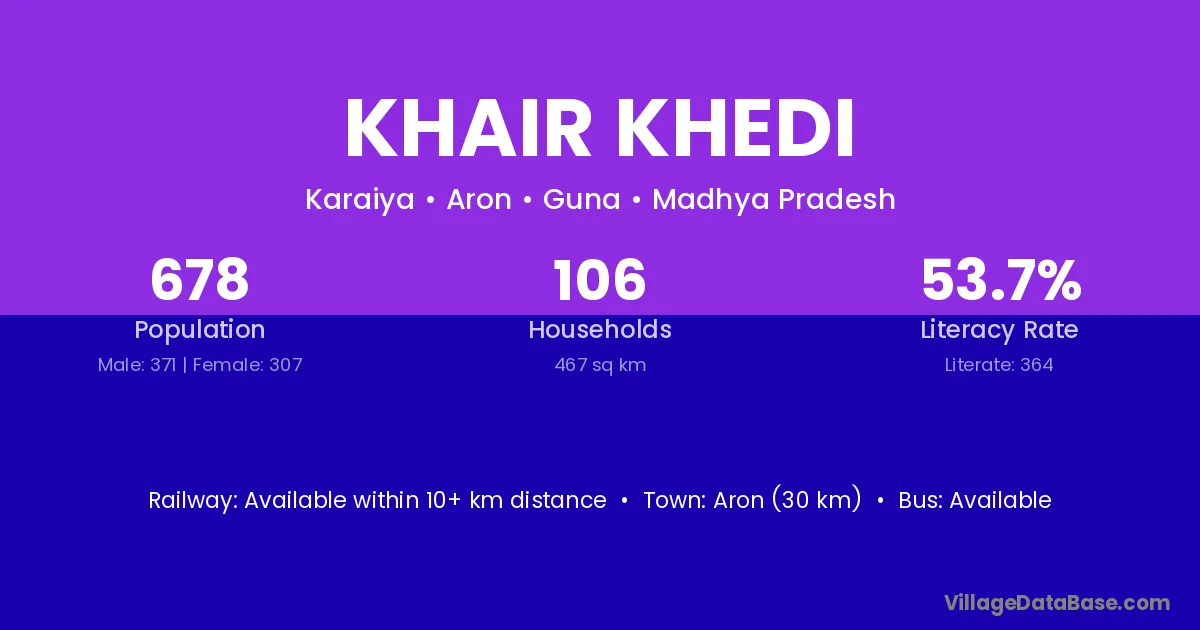 Aron (30 km) is the nearest town to Khair Khedi village for major economic activities and is located approximately 30 km away.