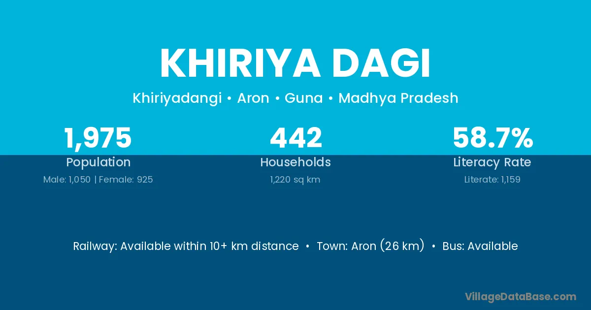 Aron (26 km) is the nearest town to Khiriya Dagi village for major economic activities and is located approximately 26 km away.