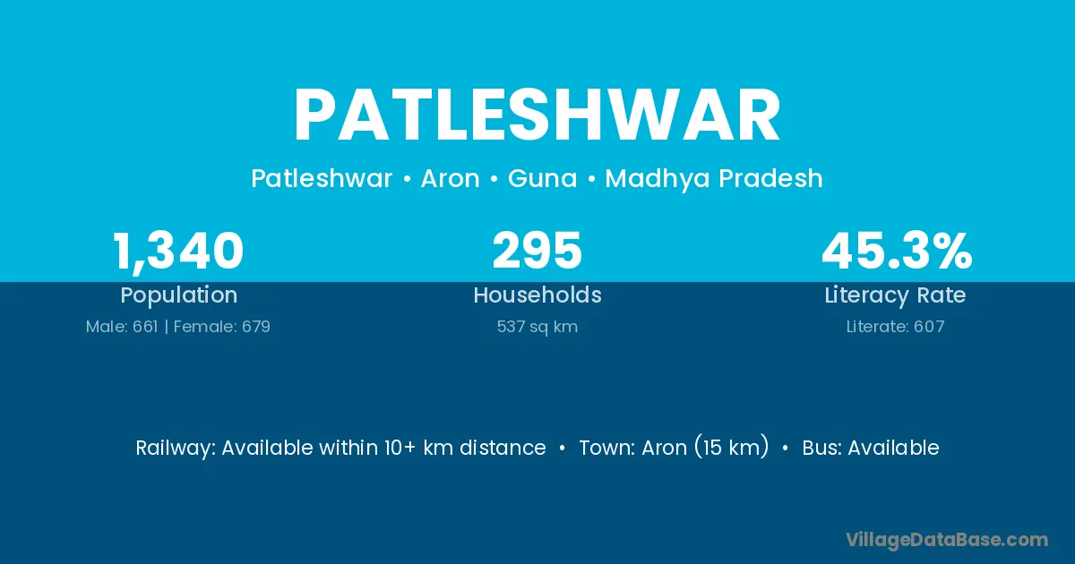Aron (15 km) is the nearest town to Patleshwar village for major economic activities and is located approximately 15 km away.