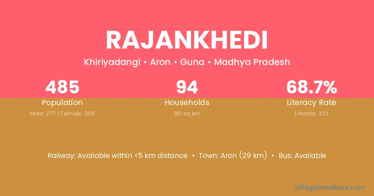 Rajankhedi village has a total population of 485 people, of which 277 are males and 208 are females.