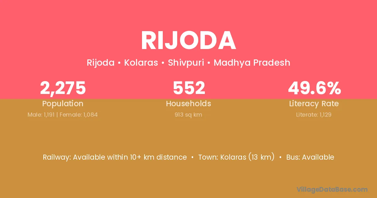 The literacy rate of Rijoda village is 36.09%. Male literacy stands at 43.01% and female literacy at 28.43%.