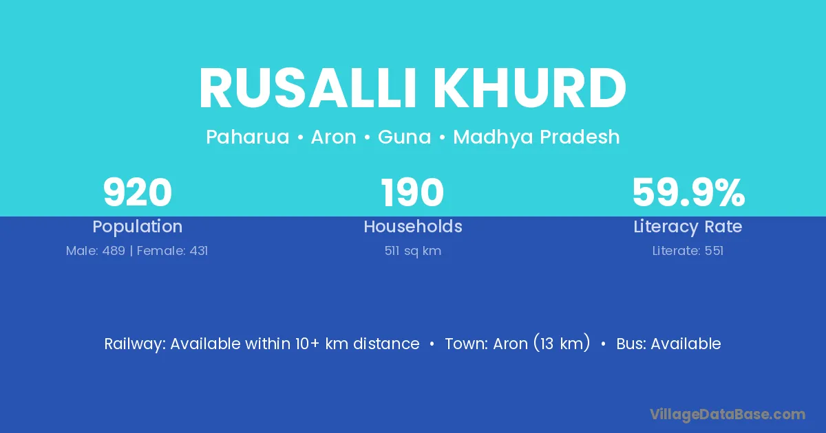 Aron (13 km) is the nearest town to Rusalli Khurd village for major economic activities and is located approximately 13 km away.