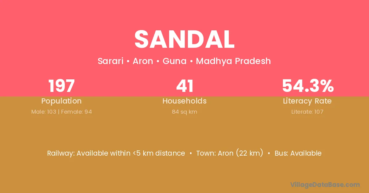 Aron (22 km) is the nearest town to Sandal village for major economic activities and is located approximately 22 km away.