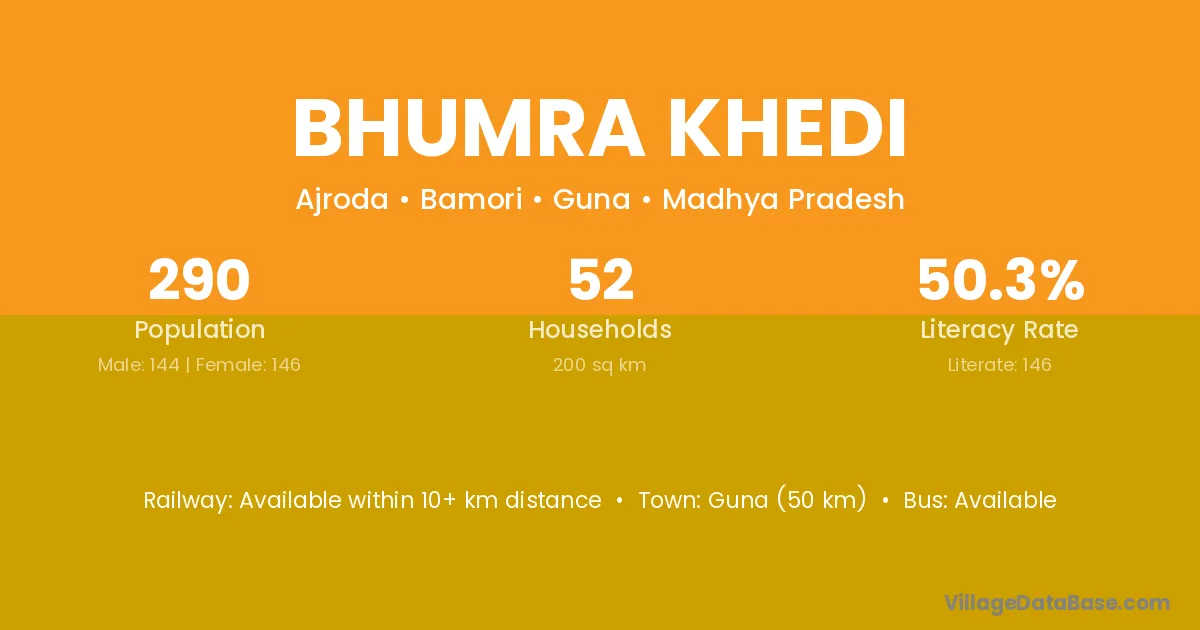 Guna (50 km) is the nearest town to Bhumra Khedi village for major economic activities and is located approximately 50 km away.
