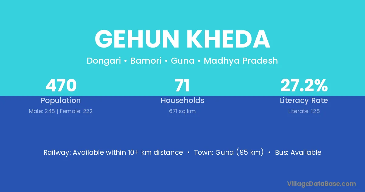 Guna (95 km) is the nearest town to Gehun Kheda village for major economic activities and is located approximately 95 km away.