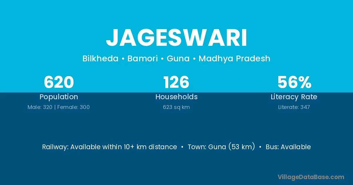 Guna (53 km) is the nearest town to Jageswari village for major economic activities and is located approximately 53 km away.