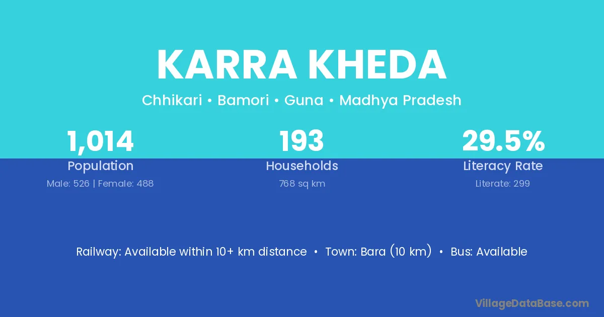 Bara (10 km) is the nearest town to Karra Kheda village for major economic activities and is located approximately 10 km away.