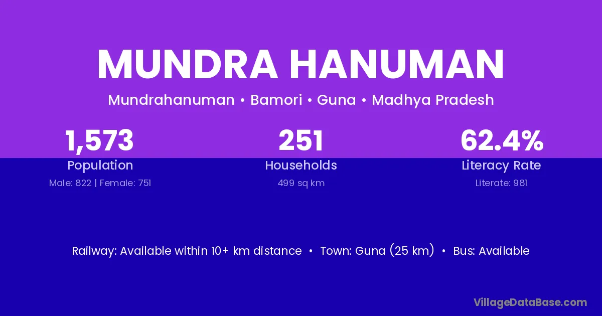 Guna (25 km) is the nearest town to Mundra Hanuman village for major economic activities and is located approximately 25 km away.